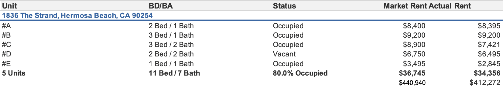 Offered at an incredible value of only $2M per unit, 1836 The Strand presents an unparalleled opportunity to own a piece of the iconic Strand lifestyle at a price well below Hermosa Strand individual condo values. This remarkable income property offers excellent investment potential, generating a monthly income of $35,298 with a favorable Gross Rent Multiplier (GRM) of 24. The unique opportunity to live in the penthouse owner's unit while maximizing rental income from the remaining units presents numerous possibilities. Additionally, with a walk score of 85, this beachfront gem allows for convenient access to renowned schools, freeways, and major destinations like LAX, Santa Monica and downtown LA.